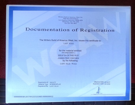WGA - WRITERS GUILD OF AMERICA - CERTIFICATE “STARQUEEN - HELP IS ON THE WAY - JADEN THE UNICORN - BY LADY ELLE - SCREENPLAY-BOOK PDF 111 PAGES AND 3 COLOR INTRODUCTION PAGES WGA REGISTERED ON 9-12-2017 SENT TO UCC ON: 9-14-2017.
